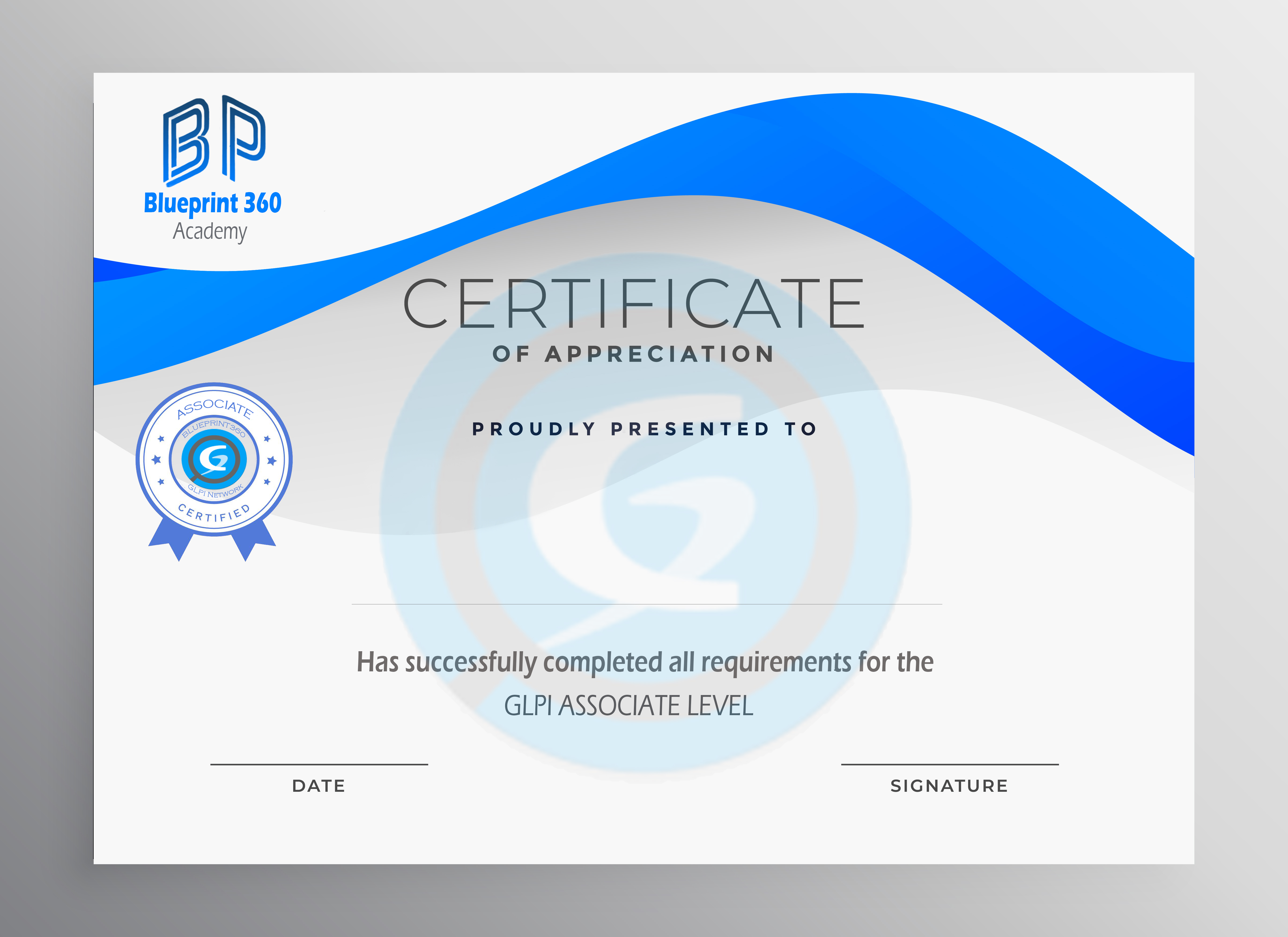 - After completing the first level exam, you will receive a certified Associate level from the official partner GLPI which is Blueprint360
